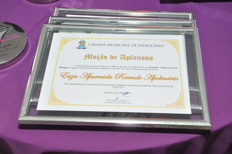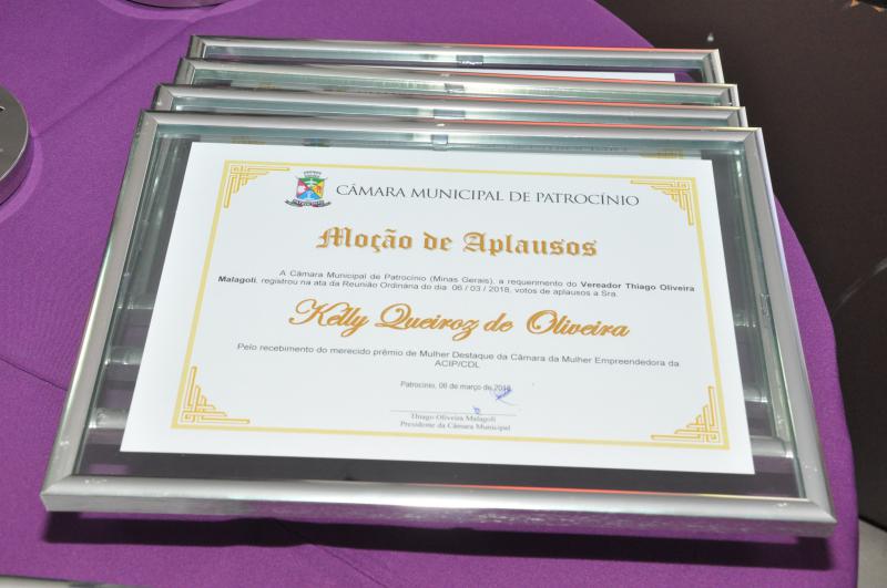 As mulheres destaque também receberam, cada uma, moção de aplausos da Câmara Municipal de Patrocínio entregue pelo presidente da Casa de Leis, vereador Thiago Malagoli, e pelas vereadoras Adriana de Paula, Marcilene Jacinto, Neusa Mendes e Raquel Rezende.