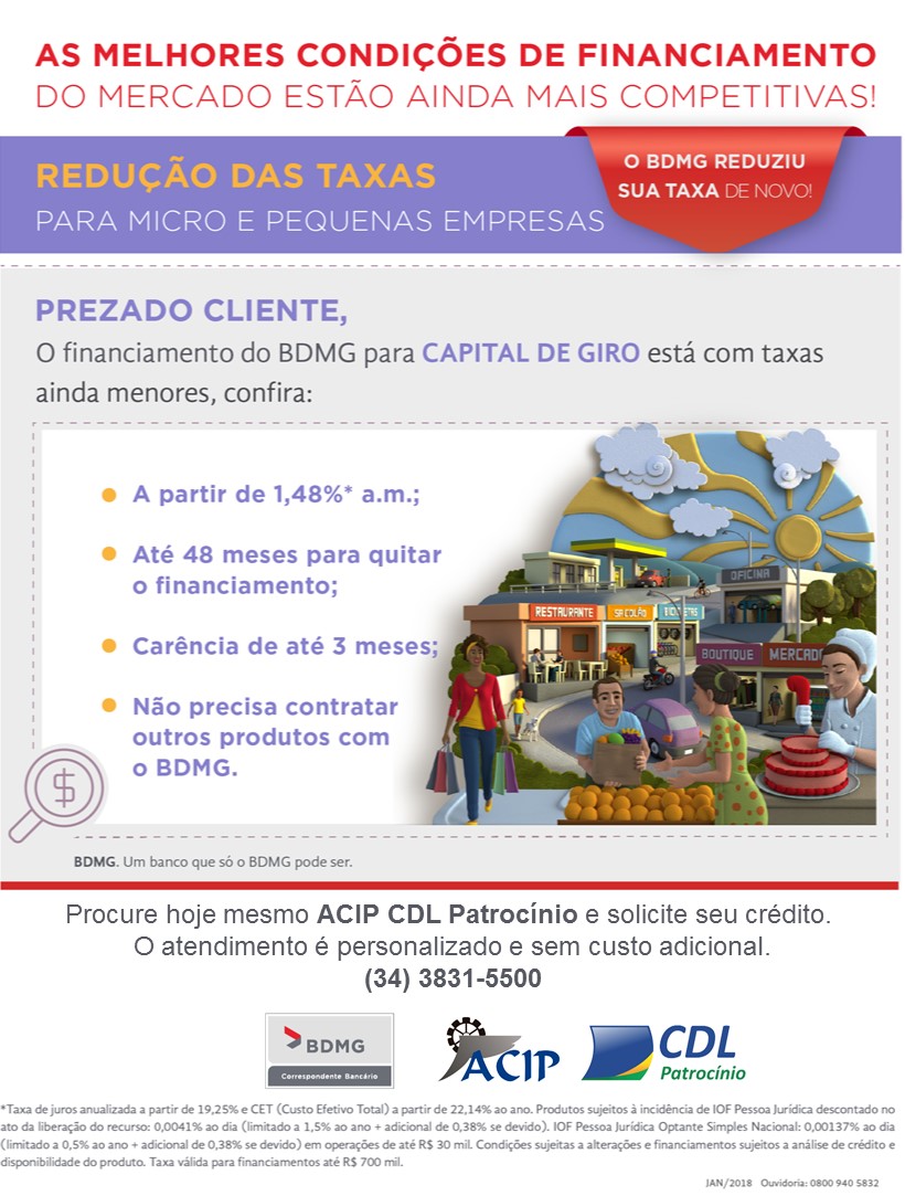 Mais informações pelo 3831-5500. Visite também a fanpage: ACIP CDL Patrocínio.
