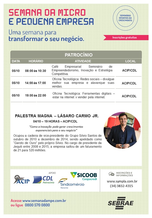 Realizada em Patrocínio, a Semana da Micro e Pequena Empresa teve como objetivo reunir empreendedores, empresas de micro e pequeno porte e potenciais empresários para discutirem temas como inovação, atendimento ao cliente, empreendedorismo e tendências de mercado.