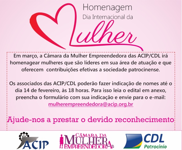 Mais informações nas ACIP/CDL, pelo telefone 3831-5500 ramal 8 ou pelo e-mail This email address is being protected from spambots. You need JavaScript enabled to view it.">This email address is being protected from spambots. You need JavaScript enabled to view it., com Cleide Ribeiro Araújo