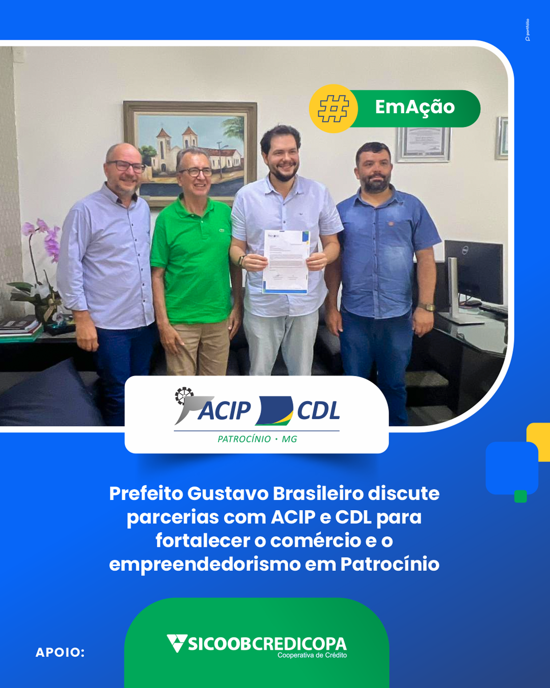 Na manhã desta segunda-feira, 21 de janeiro, o prefeito de Patrocínio, Gustavo Brasileiro, acompanhado do vice-prefeito Maurício Cunha e sua equipe, recebeu os presidentes da Associação Comercial e Industrial de Patrocínio (ACIP), Wander Jr. de Carvalho, e da Câmara de Dirigentes Lojistas (CDL), Thiago Batista de Almeida, para uma reunião estratégica.