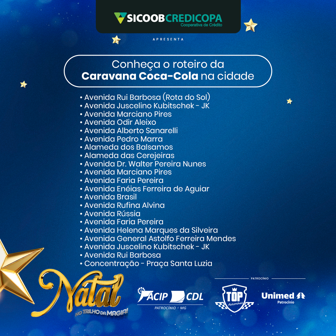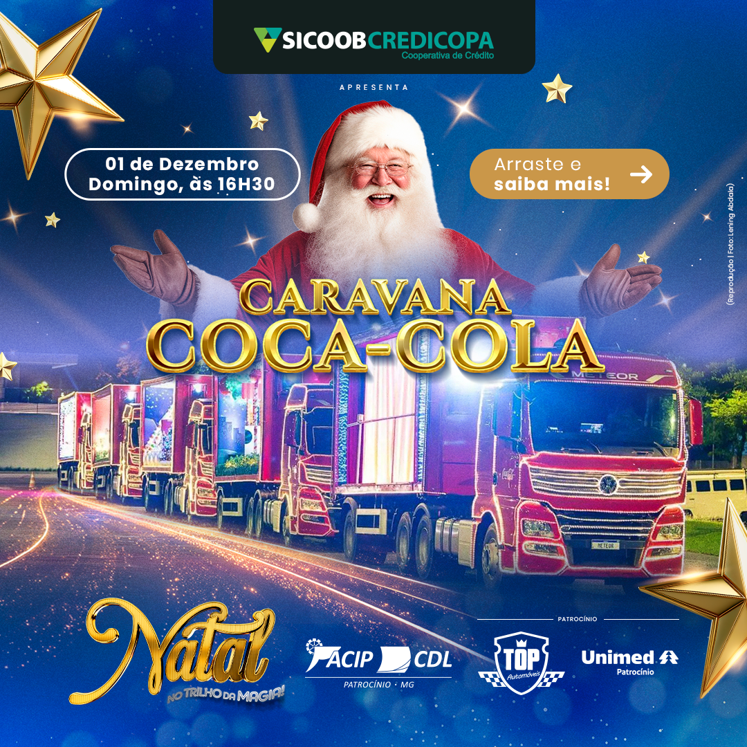A tradicional Caravana Coca-Cola, é um evento que promete encantar crianças e adultos com a magia do Natal. A carreata em Patrocínio terá início às 16h30, saindo pela Avenida Rui Barbosa região do Posto Rota do Sol, passando por diversos bairros da cidade através de avenidas, com os emblemáticos caminhões iluminados da marca, levando o Papai Noel e sua equipe de ajudantes.