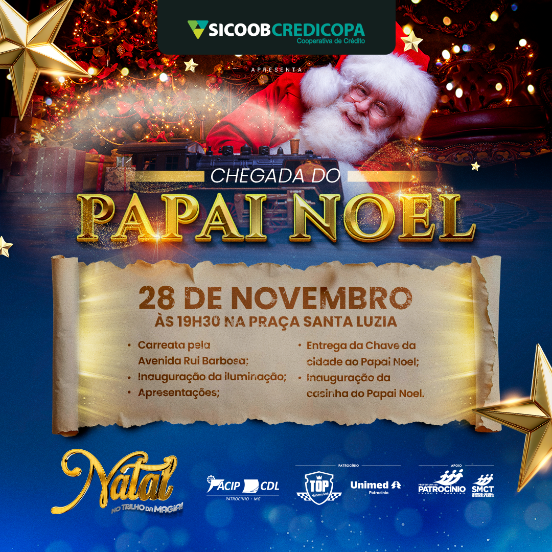A chegada do Papai Noel, este ano vai acontecer no dia 30 de novembro, por meio da parceria das ACIP/CDL com a Prefeitura Municipal de Patrocínio, através da Secretaria Municipal de Cultura e Turismo. Além da chegada do Papai Noel, na noite de sábado dia 30, também será acesa a iluminação natalina da cidade. A tradicional casinha do Papai Noel, igual aos últimos anos, seguirá ao lado da Igreja de Santa Luzia, e com abertura ao público já na noite da inauguração, ou seja, dia 30 de novembro.