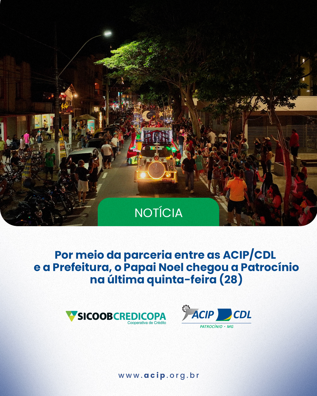 O presidente da ACIP, Wander Júnior De Carvalho, disse que a tão aguardada chegada do Papai Noel marca oficialmente o início das festividades natalinas em Patrocínio. “Vale lembrar que a promoção das ACIP/CDL, a Campanha de Natal intitulada: No Trilho da Magia!, já está ocorrendo desde o dia 01 de novembro” explicou. A Campanha de Natal das Entidades vai sortear entre outros prêmios dois carros zero, entre os clientes que fizerem compras nas empresas participantes da Campanha, ganharem cupons e os cadastrar no aplicativo “ACIP CDL de Patrocínio” disponível gratuitamente para baixar nas modalidades Android e IOS.