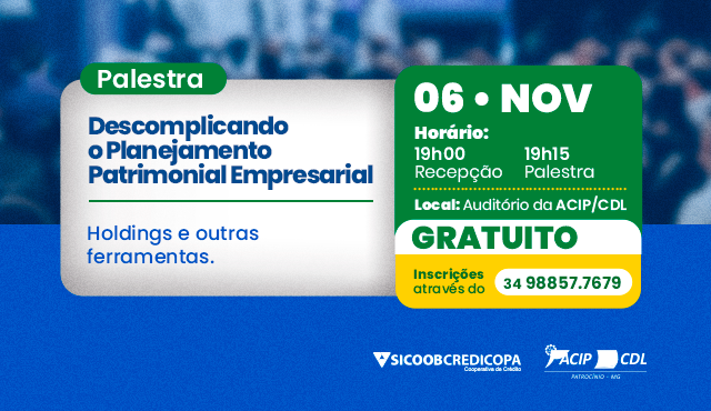 Nesta quarta-feira dia 06 de novembro, a Associação Comercial e Industrial de Patrocínio – ACIP e a Câmara de Dirigentes Lojistas – CDL, realizarão no auditório das Entidades, uma palestra com a temática: "Descomplicando o Planejamento Patrimonial Empresarial, Holdings e Outras Ferramentas". O evento é gratuito, aberto a todo o público. Para participar é importante que se faça a inscrição antecipada, mas, havendo vaga, é possível se inscrever na hora do mesmo.