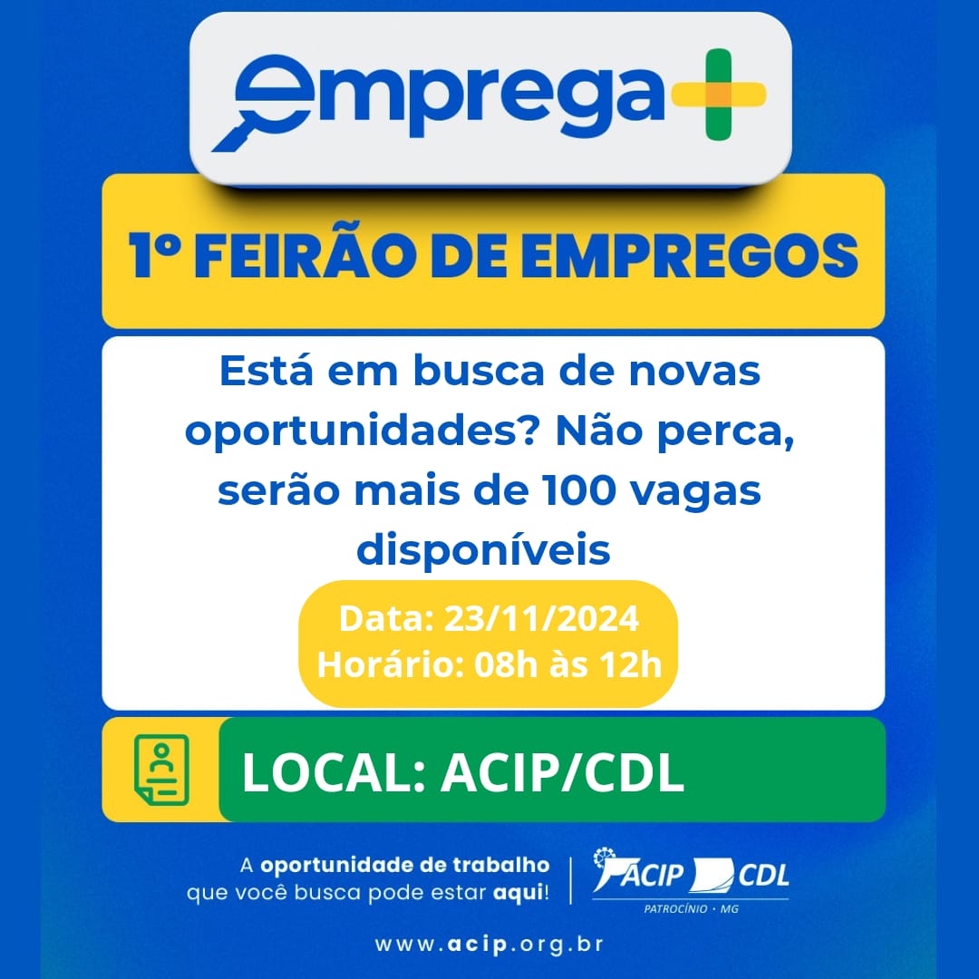 A Associação Comercial e Industrial de Patrocínio – ACIP, e a Câmara de Dirigentes Lojistas – CDL, realizarão Feirão de Empregos, no sábado dia 23 de novembro, através do programa Emprega + ACIP/CDL. O evento oferecerá mais de 130 (cento e trinta), vagas de emprego em diversas áreas, sendo uma oportunidade para quem busca por um novo trabalho ou até mesmo o primeiro emprego.