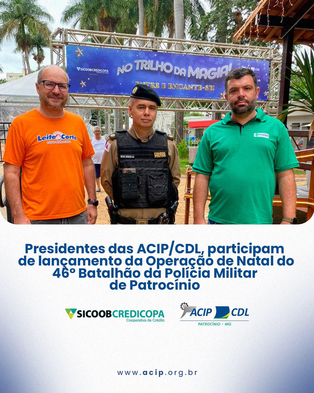 Diante as festividades de final de ano, época em que muitas pessoas vêm para a cidade de Patrocínio, e em decorrência da Campanha de Natal, “No Trilho da Magia!” na última sexta-feira dia 29 de novembro, os presidentes da Associação Comercial e Industrial de Patrocínio – ACIP, Wander Junior De Carvalho e da Câmara de Dirigentes Lojistas – CDL, Thiago Batista De Almeida, estiveram na sede do 46 º Batalhão da Policia Militar conversando com o comandante da unidade, tenente coronel, Sócrates Queiroz Caixeta.