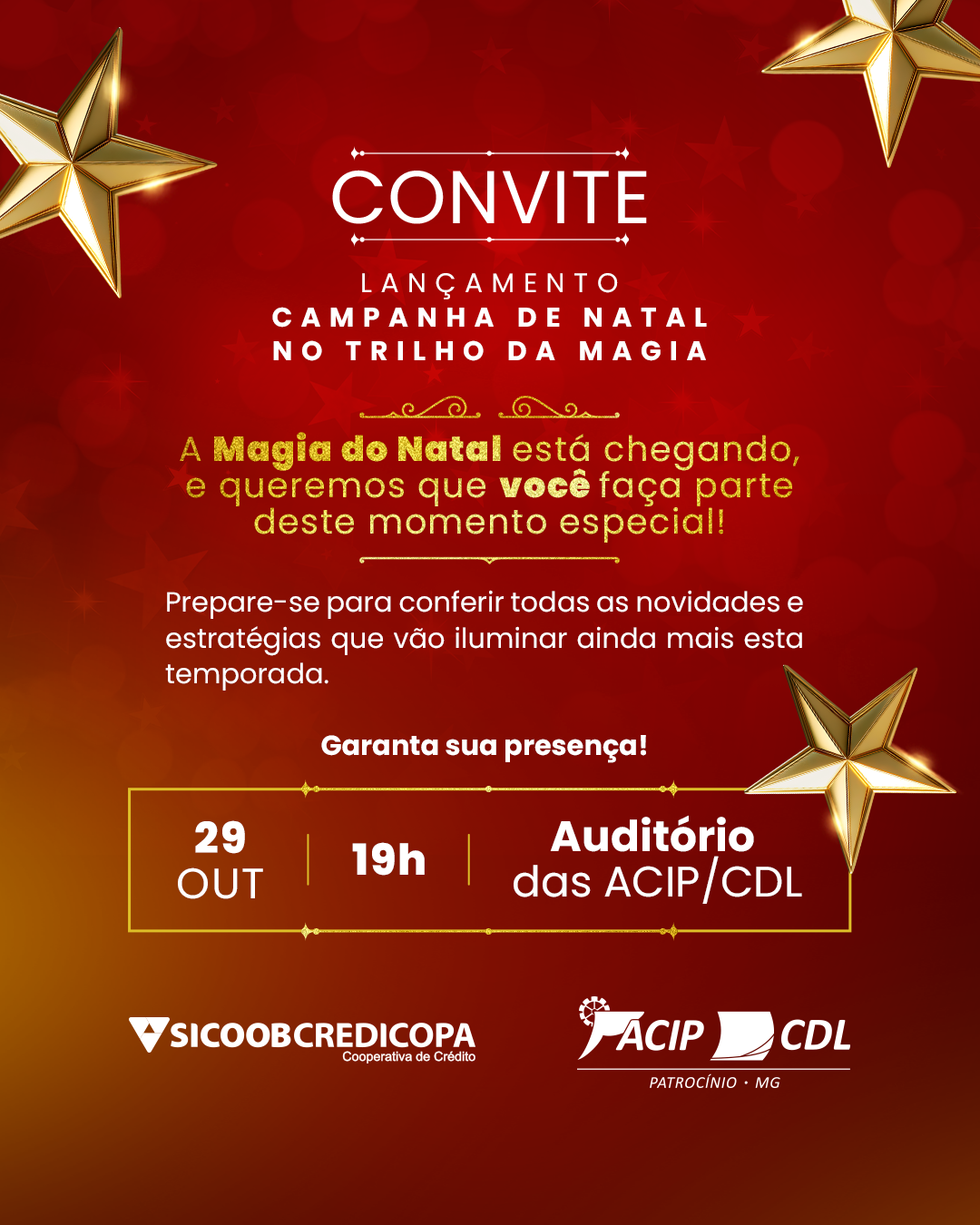 No dia 29 de outubro, a Associação Comercial e Industrial de Patrocinio – ACIP, e a Câmara de Dirigentes Lojistas – CDL, apresentarão para os seus associados, e toda a imprensa, a Campanha de Natal das Entidades do ano de 2024. O evento de apresentação da Campanha de Natal, vai acontecer no auditório das ACIP/CDL a partir das 19h.