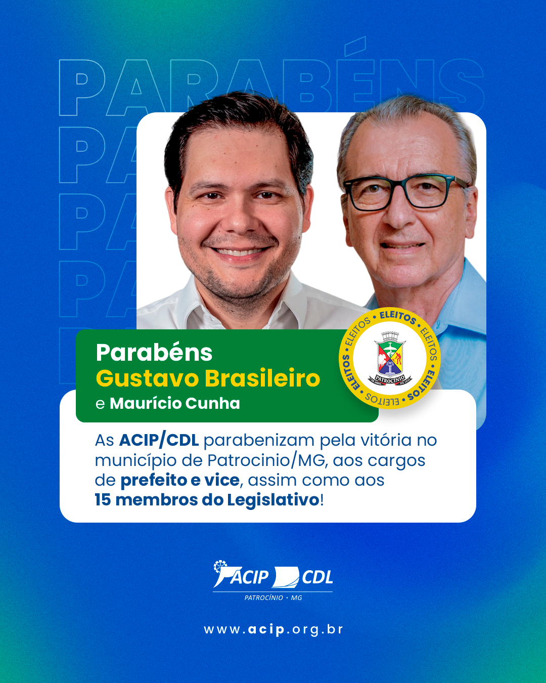 O presidente da Associação Comercial e Industrial de Patrocínio – ACIP, Wander Júnior De Carvalho, e o presidente da Câmara de Dirigentes Lojistas – CDL, Thiago Batista de Almeida, juntamente as suas diretorias, congratulam com a vitória de Gustavo Brasileiro e Maurício Cunha, respectivamente prefeito e vice do Município de Patrocínio, eleitos na noite deste domingo 06 de outubro e aos 15 vereadores da Câmara Municipal de Patrocínio.