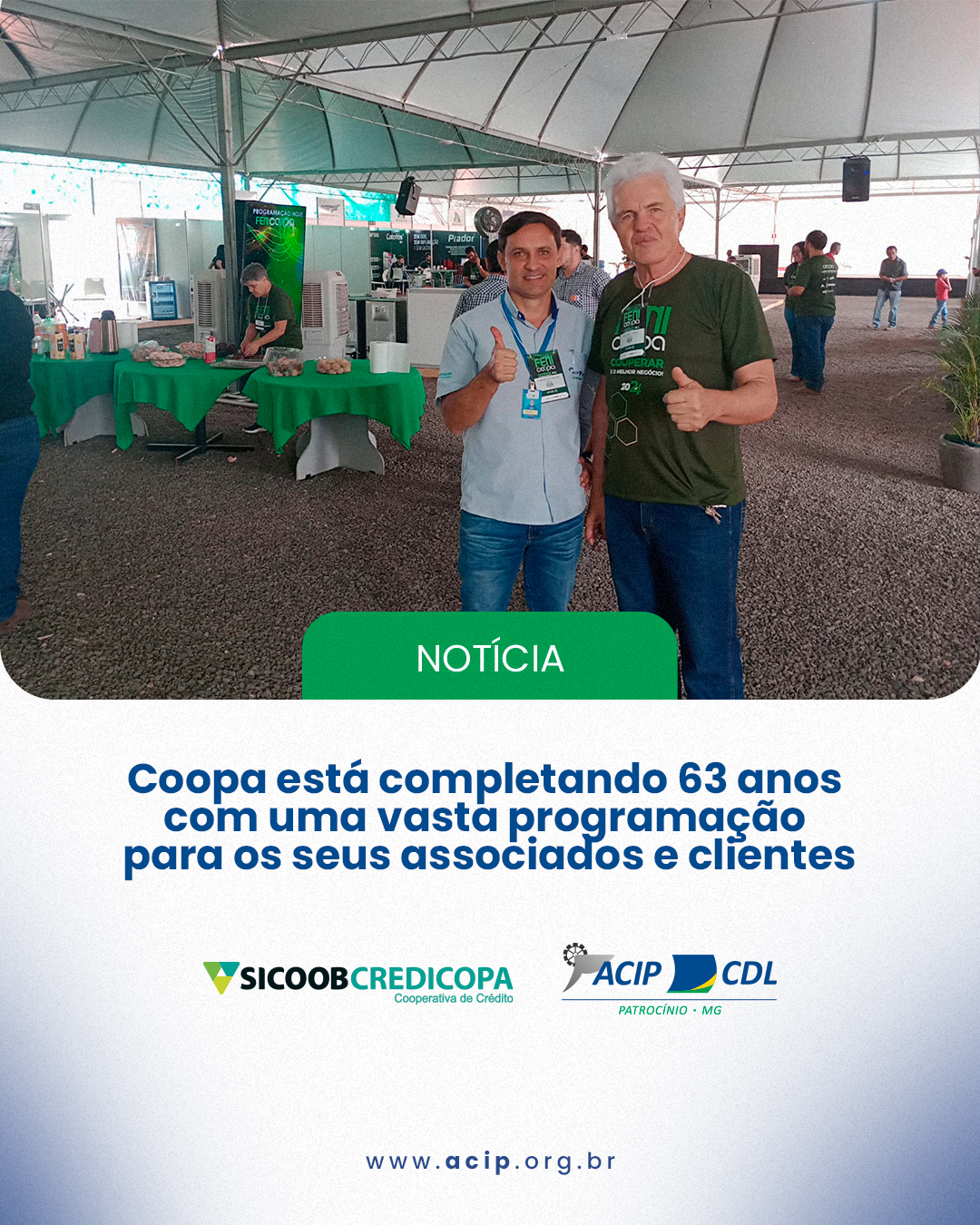 As ACIP/CDL parabenizam, e desejam sucesso a Cooperativa Agropecuária de Patrocínio.