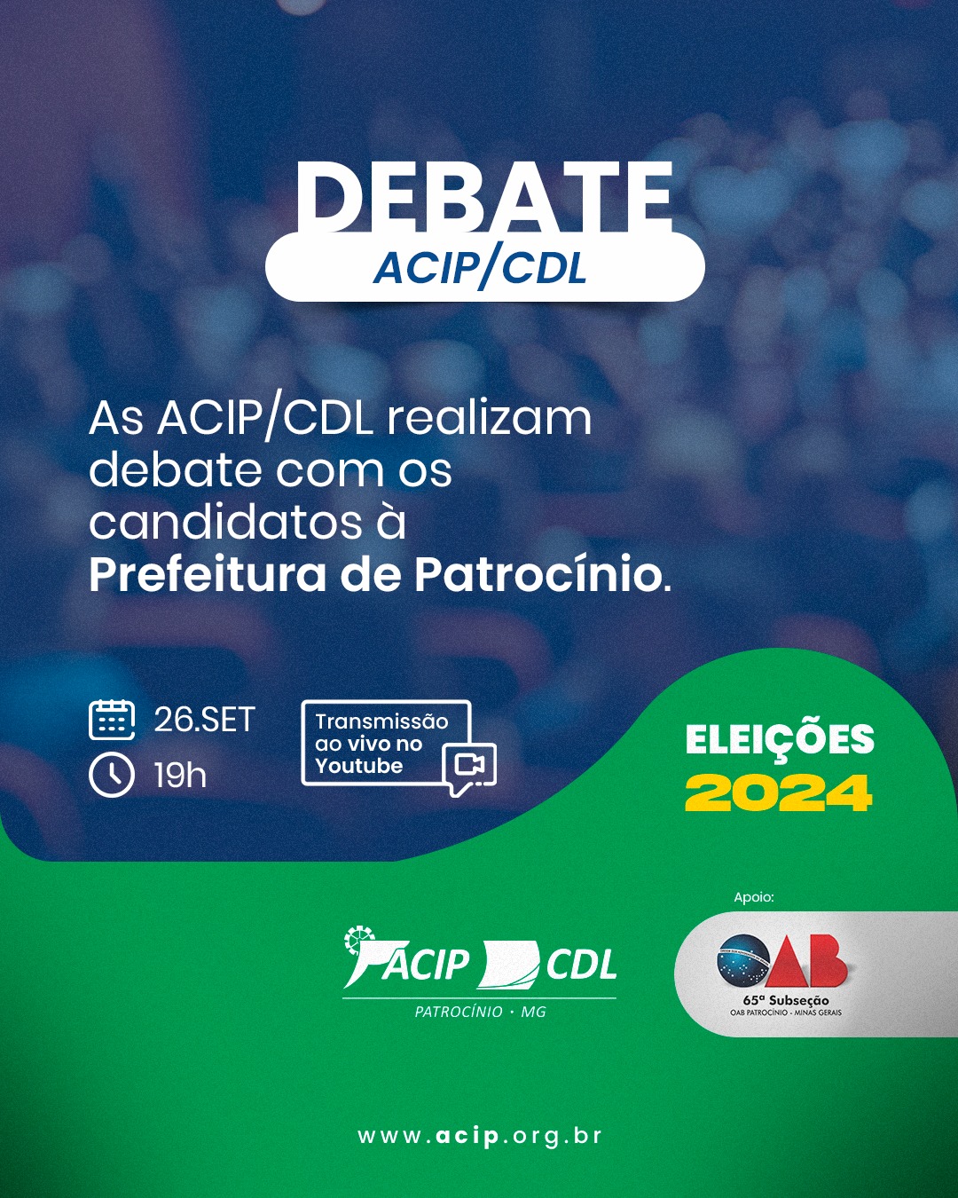 A Associação Comercial e Industrial de Patrocínio – ACIP, e a Câmara de Dirigentes Lojistas - CDL, realizarão pela primeira na história das duas Entidades, Debate com os candidatos a prefeito (a) de Patrocínio nas eleições de 2024. Para participar do Debate, foram convidados os três candidatos que concorrem ao cargo de chefe do Executivo Municipal de Patrocínio.