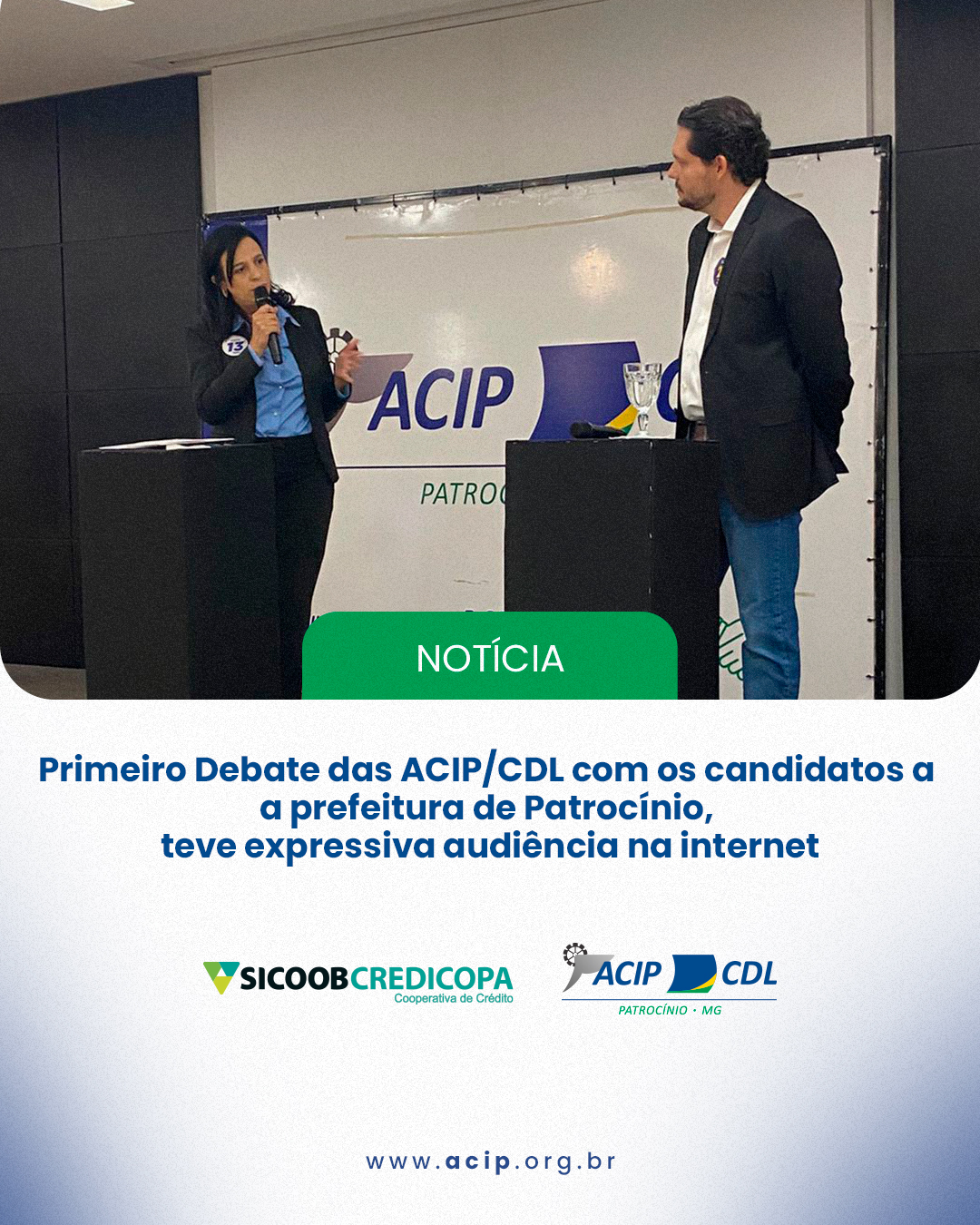 O programa será realizado a partir 19h desta quinta-feira dia 26, no auditório da ACIP/CDL e transmitido em tempo real com sinal aberto a todo o público, associados, e não associados, através do canal das Entidades no YouTube. O Debate das ACIP/CDL com os candidatos a prefeito (a) do Município de Patrocínio, será uma oportunidade para o eleitor e a eleitora, conhecerem melhor as ideias e planos de cada candidato para o desenvolvimento da nossa cidade.