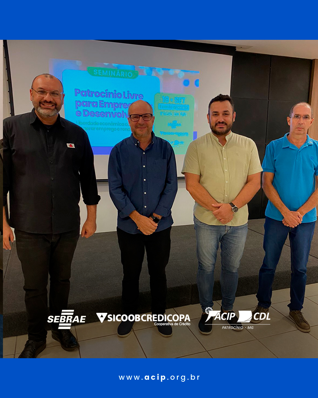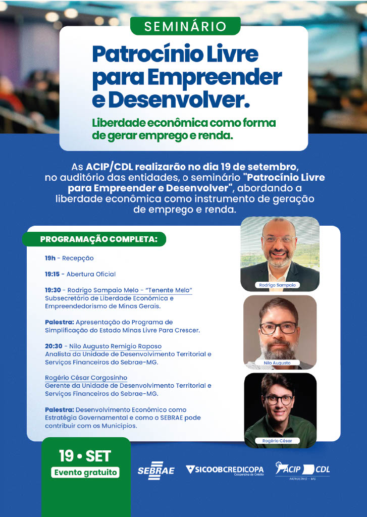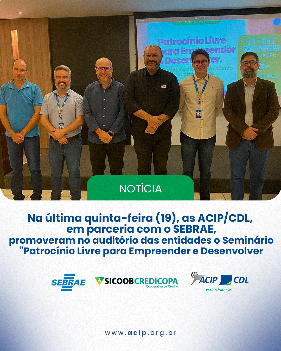 Na noite da última quinta-feira (19), a Associação Comercial e Industrial de Patrocínio - ACIP, e Câmara de Dirigentes Lojistas - CDL em parceria com o Sebrae-MG, promoveram no auditório das entidades o Seminário "Patrocínio Livre para Empreender e Desenvolver: Liberdade Econômica como Forma de Gerar Emprego e Renda". Um grande número de pessoas esteve acompanhando o Seminário, que apresentou três palestrantes com conhecimento pleno da área política, e do desenvolvimento econômico e empreendedorismo.