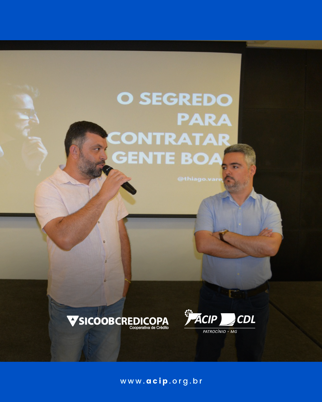 Na noite da última terça-feira dia 30 de julho, aconteceu no auditório da Associação Comercial e Industrial de Patrocínio – ACIP, e da Câmara de Dirigentes Lojistas – CDL, o lançamento do Programa Emprega + ACIP/CDL. Para o lançamento, por meio de parceria com o Sebrae-MG, foi realizada a palestra com a temática “Contrate Bem e Treine Sempre: O Segredo para Contratar Gente Boa", ministrada por Thiago Varejo, renomado especialista em estratégias comerciais.