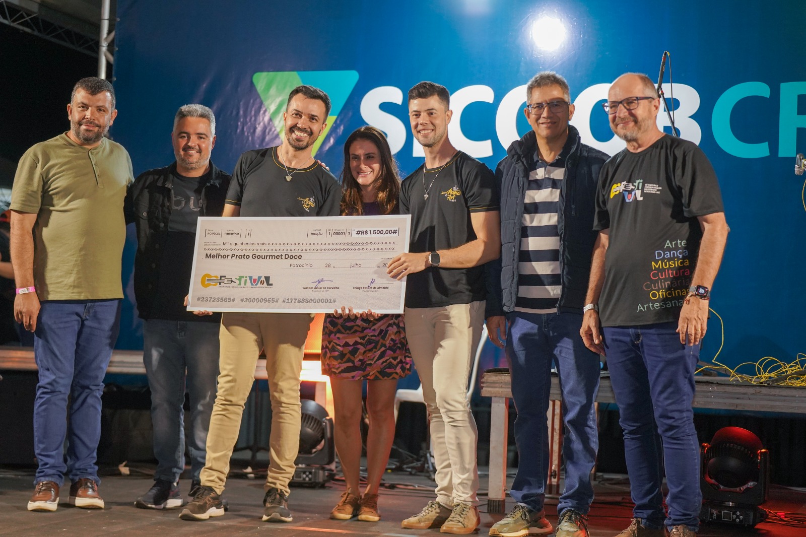 Na foto: Presidente da CDL, Thiago Almeida, coordenador do Sebrae na microrregião de Patrocínio, Renato Moreira, Delton e Douglas proprietários do Aroma e Art Café, ao centro a coordenadora da gastronomia do Festival, Angélica Parreira, presidente do Sindcomércio de Patrocínio, Carlos Apolinário e o presidente da ACIP, Wander Júnior.