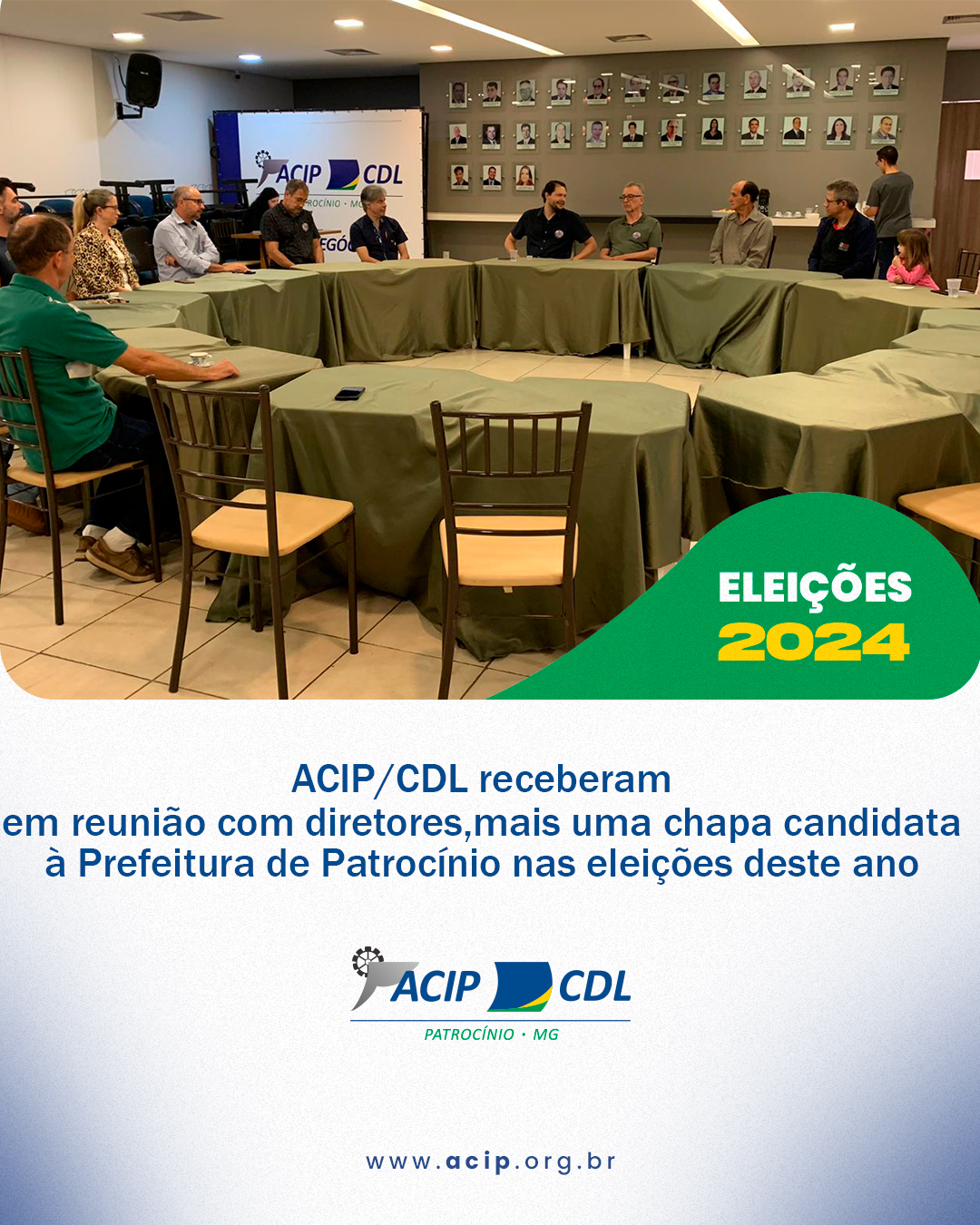 A Associação Comercial e Industrial de Patrocínio – ACIP, e a Câmara de Dirigentes Lojistas – CDL, através de seus presidentes, Wander Júnior De Carvalho e Thiago Batista De Almeida, respectivamente, com o objetivo de conhecer enquanto representantes das entidades empresariais do Município, as propostas dos candidatos aos cargos de Prefeito (a), e Vice de Patrocínio - MG, estão convidado de forma democrática para uma apresentação na sede das ACIP/CDL, os candidatos que nas eleições de 2024, pleiteiam os cargos do Executivo Municipal.