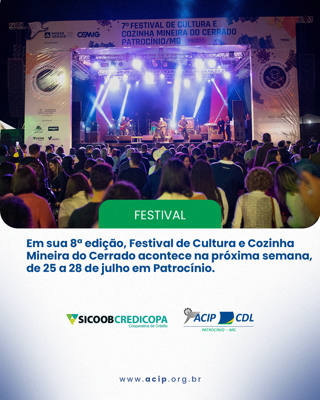 A Associação Cultural da Associação Comercial de Patrocínio, juntamente com a Associação Comercial e Industrial de Patrocínio – ACIP, e a Câmara de Dirigentes Lojistas – CDL, realizarão com entrada franca, no Espaço Cultural em Patrocínio entre os dias, 25 a 28 de julho, o 8º Festival de Cultura e Cozinha Mineira do Cerrado.