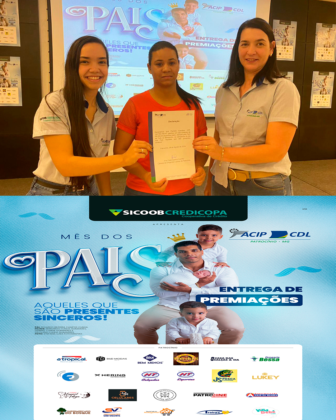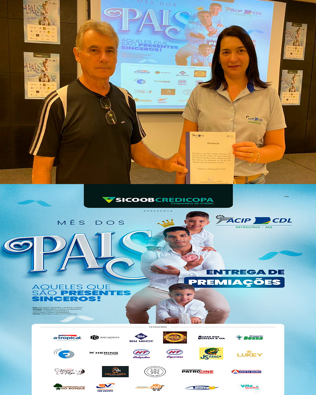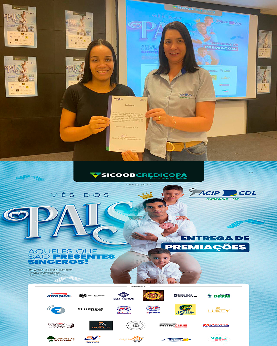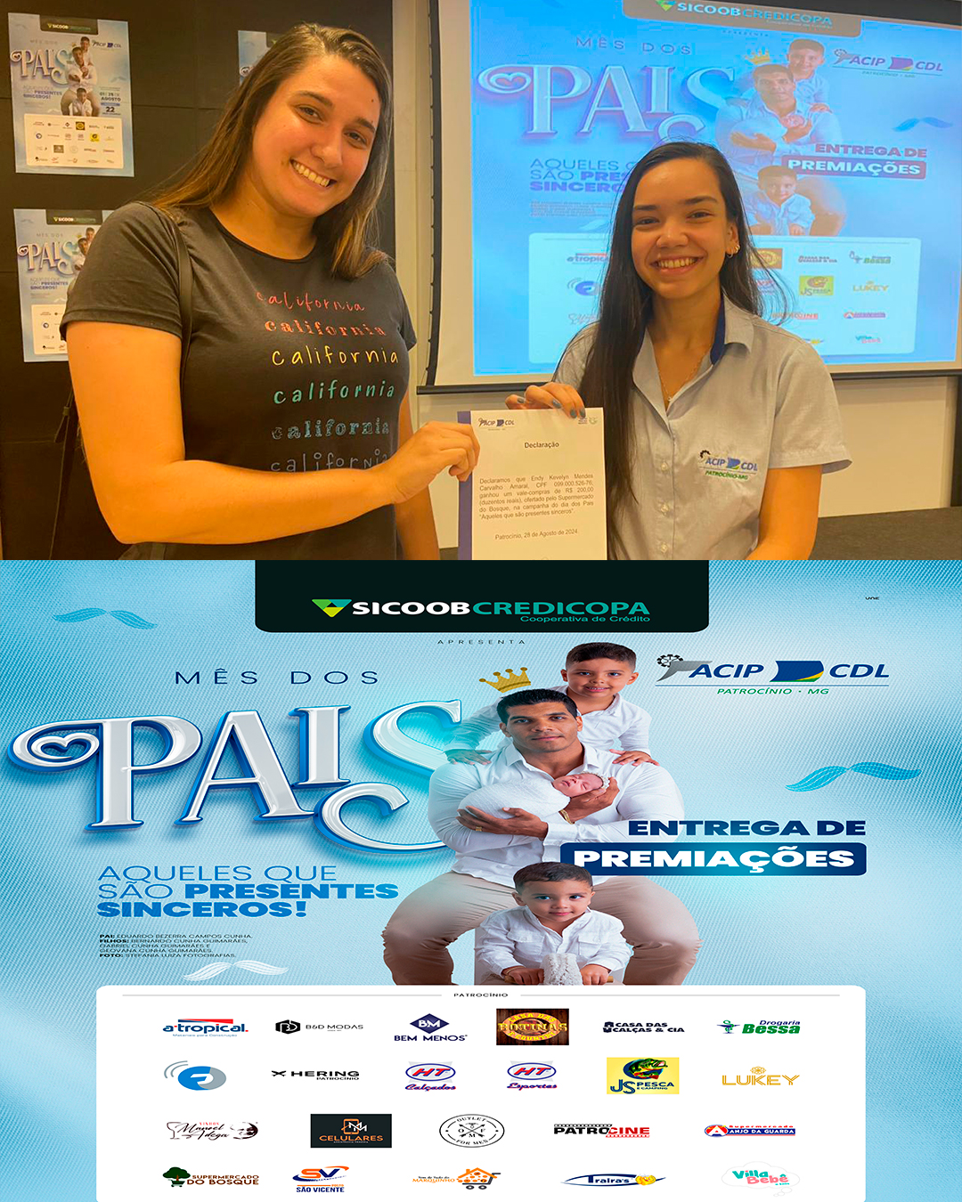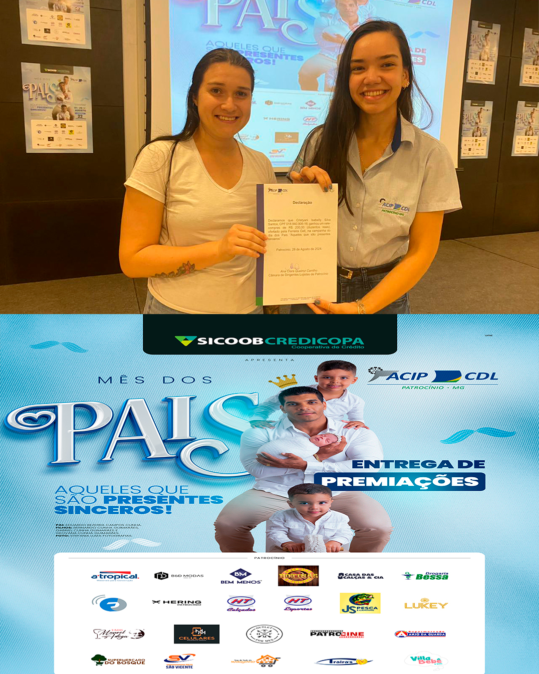 A Campanha do Dia dos Pais faz parte da Campanha de Valorização do Comércio Local, que é realizada através da parceria entre as ACIP/CDL, e o Sicoob Credicopa. Neste mês de agosto, foram 22 vales-compras instantâneos no valor de R$200,00, (duzentos reais) cada um, para serem gastos nas empresas específicas de cada vale-compras, pelo ganhador.